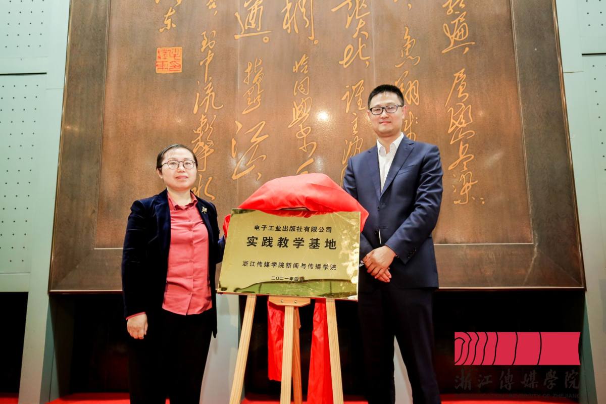 崔波和赵晨阳分别代表新闻与传播学院和电子工业出版社签署合作协议,并为“实践教学基地”揭牌。