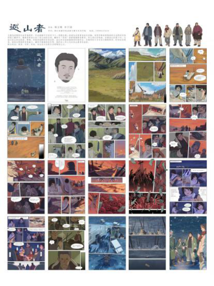 《巡山者》由动画与数字艺术学院学生林方晴和教师申宁涛共同完成,作品根据可可西里卫士——英雄杰桑·索南达杰的事迹改编,采用多格故事漫画方式跨时空讲述了藏羚羊、偷猎者和巡山队三者之间的关系。藏铃羊“男孩”族群被偷猎者猎杀,对人类心存敌意,后被巡山队救下后,与巡山队之间由敌意、警惕、怀疑到逐渐信任的过程,表达了人与自然和谐相处的理念、希望与追求。