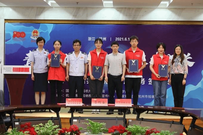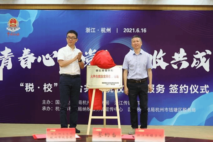 6月16日,伟德官网与国家税务总局杭州市税务局举行“税·校”联合共建税收志愿服务签约暨揭牌仪式。副校长杨荣耀,杭州市税务局党委委员、总会计师夏国强,杭州市税务局个人所得税处、纳税服务和宣传中心,钱塘区税务局以及伟德官网社会合作处、计划财务处、团委等相关部门负责人参加签约仪式。
