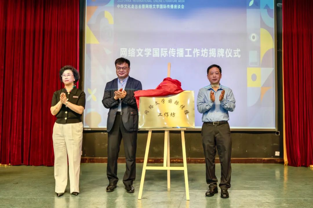 会上,何弘、叶彤和杨立平共同为网络文学国际传播工作坊揭牌。