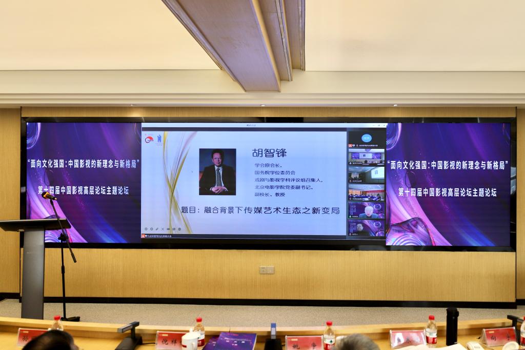 胡智锋作题为《融合背景下传媒艺术生态之新变局》的演讲;学会原副会长,教育部戏剧与影视学类教学指导委员会主任,北京师范大学教授周星作题为《中国影视高潮的创作方向:呼应时代超越时代》的演讲;学会副会长,国家广播电视总局媒体融合发展司原司长杨杰作题为《高新视频技术与文化强国建设》的演讲;学会副会长、北京大学艺术学院教授陈旭光作题为《新主流电影的文化空间生产及其“工业美学”反思》的演讲;张国涛作题为《面向文化强国:中国影视高质量发展的机遇与路径》的演讲。