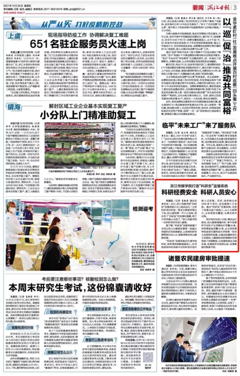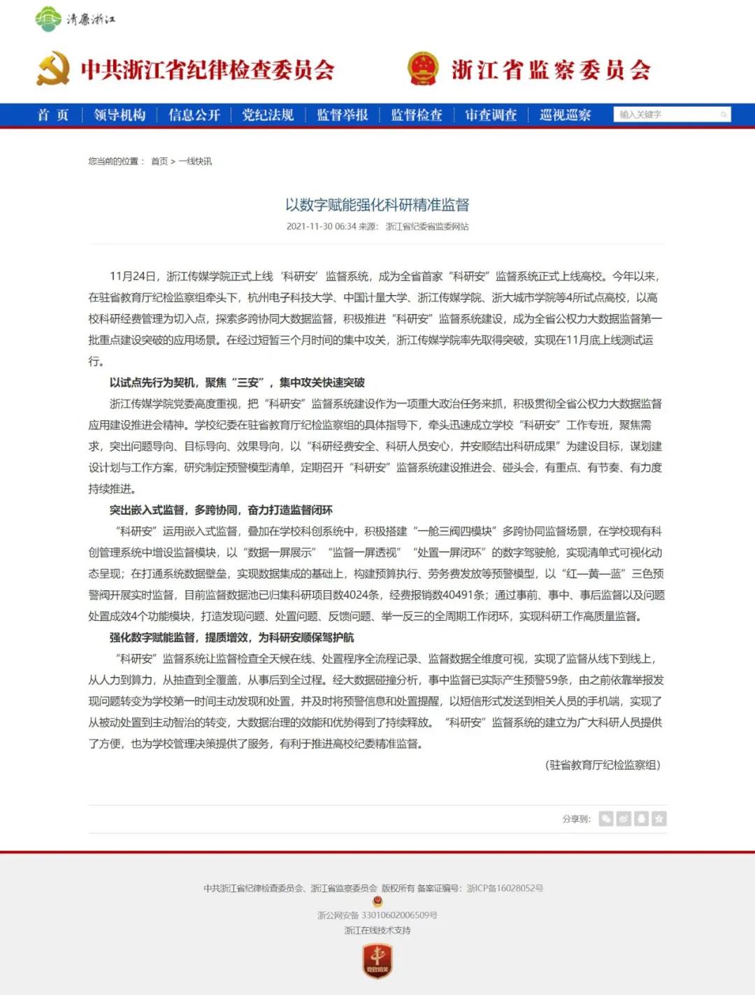 2021年11月24日,伟德官网bv1946正式上线‘科研安’监督系统,成为全省首家“科研安”监督系统正式上线高校,被《浙江日报》、浙江省纪委省监委网站等多家媒体宣传报道。