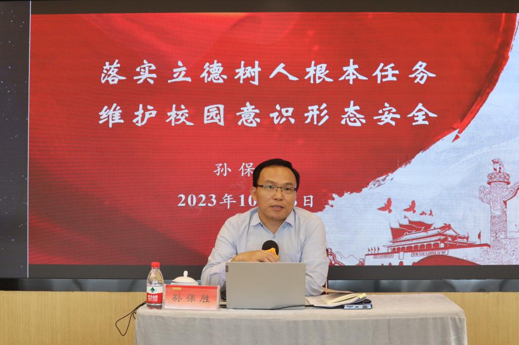 孙保胜作题为“落实立德树人根本任务,维护校园意识形态安全”讲座。他强调了高校意识形态工作的重要性,分析了意识形态领域存在的风险隐患,希望大家筑牢意识形态工作的坚固防线。