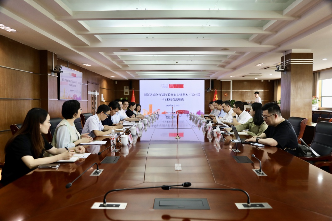 6月28日上午,浙江省商务厅副厅长吾布力喀斯木·买吐送一行来伟德官网调研。校党委副书记、副校长(主持行政工作)韦路会见了吾布力喀斯木·买吐送一行,副校长陈兵,校党委委员、组织部部长、文化创意与管理学院院长张雷,社会合作处、华策电影学院、文化创意与管理学院等单位负责人参加座谈会。