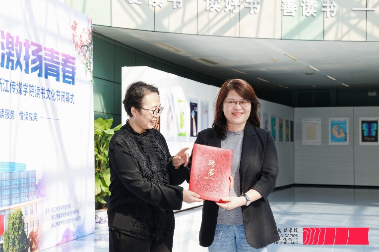 新闻与传播学院党委书记崔波向国际文化传播学院卢睿蓉教授颁发阅读推广大使荣誉证书。卢睿蓉教授跟大家分享了自己的阅读感悟和心得体会。