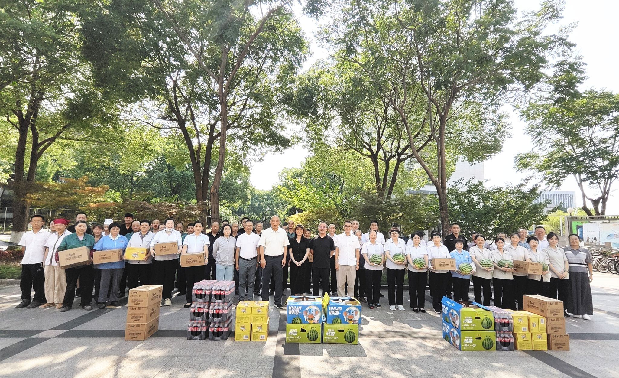 在杭州钱塘校区,校领导一行首先慰问南门保安亭的安保人员,详细询问岗位轮换和防暑措施落实情况,对他们维护校园安全稳定付出的辛勤汗水表示感谢,并叮嘱大家既要守好岗,也要做好自身防护。