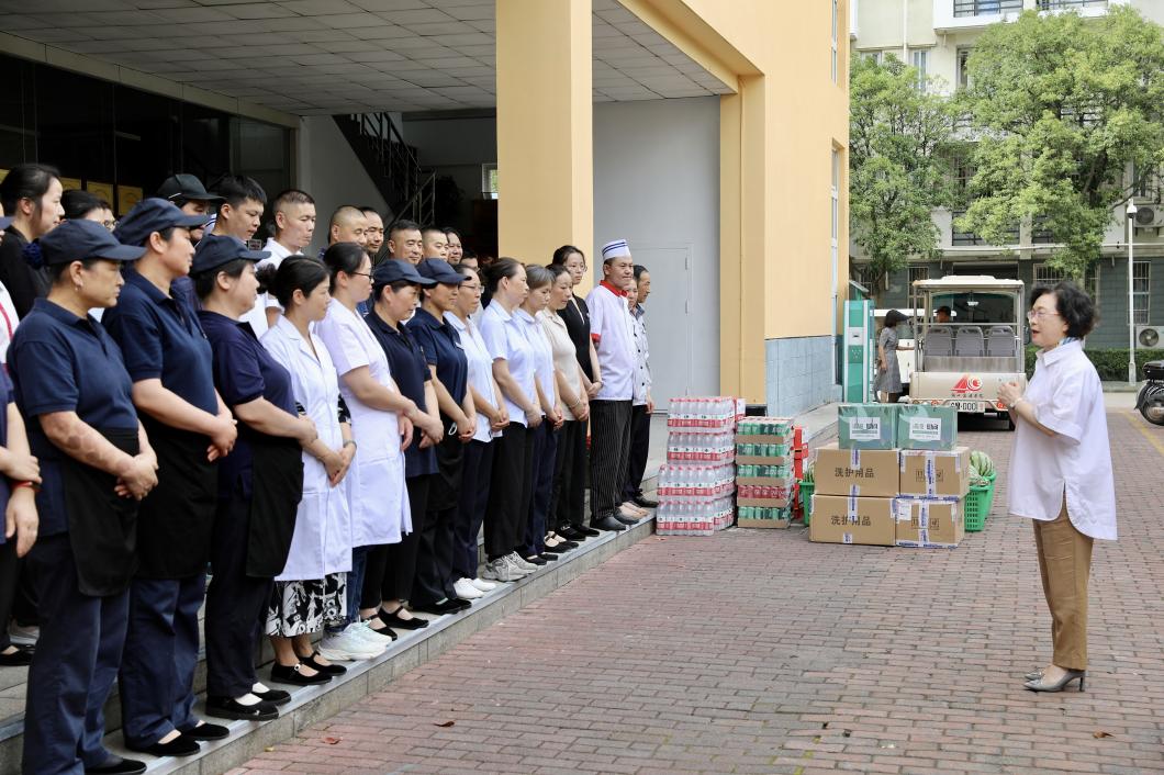 在行政楼大厅,校领导对保卫队伍为学校安全稳定作出的贡献表示肯定,对他们一直以来的辛勤工作表示感谢,并叮嘱他们要注意防暑降温,继续作好本职工作,切实维护学校安全稳定。