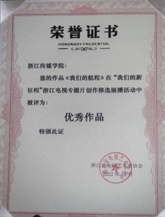 同时,还举行了“我们的新征程”浙江电视专题片创作推优展播活动颁奖仪式。本次推优展播活动共评选出10部(组)优秀作品。由电视艺术学院教师梁碧波、梁世庆领衔创作的系列片《我们的航程》获评优秀作品奖。《我们的航程》由梁碧波老师担任艺术总监,梁世庆老师担任总导演,余源伟、秦丽娜、姜荣文、虞思聪、曹国锋、覃晴、于亮、徐畅、张拓、吴鑫丰老师担任分集导演,电视艺术学院专业教师团队负责副导演、摄影、剪辑、调色、音乐、片头设计、制片等工作。系列片《我们的航程》以我省党史上重大事件为线索,深度挖掘一批代表性人物和代表性事件,展现中国共产党在浙江的奋斗历程。