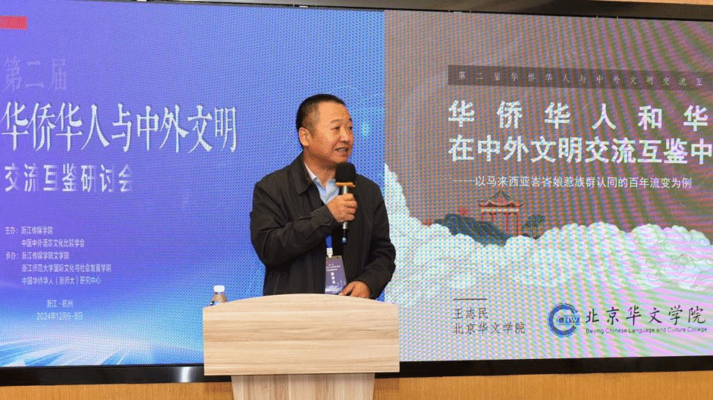 北京华文学院院长王志民以《华侨华人和教育在中外文明交流互鉴中的作用发挥——以马来西亚峇峇娘惹族群认同的百年流变为例》为题,阐述峇峇娘惹族群认同的复杂流变与传承链条,并就国际中文教育借侨出海,从家庭教育、乐龄群体、传统文化等六个层面展开研讨。
