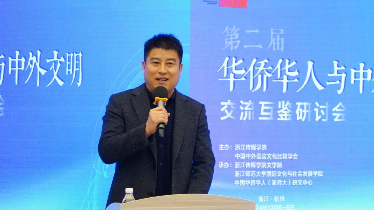 在大会主旨发言环节,张春旺以《华侨华人在中外文化交流中的地位与作用》为题,探讨华侨华人在对外交流中的优势与作用,着重指出华侨华人在传承弘扬中华文化中面临着传统媒体萎缩、交流对象阻碍、华文学校不足等挑战。