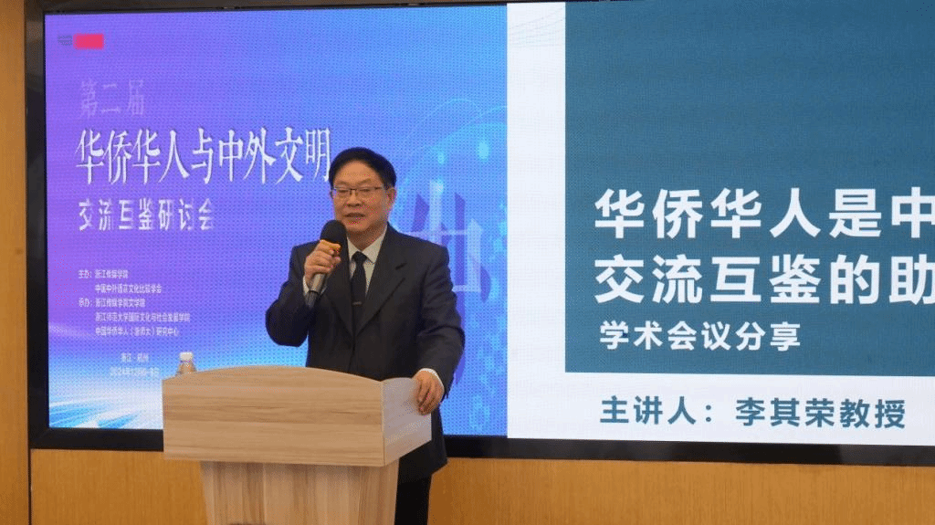 华中师范大学李其荣教授以《华侨华人是中外文明交流互鉴的助推者》为题,详细梳理中华文明与其他文明的交流与互鉴历史,提出华侨华人在推动中外文明交流互鉴中,应从中国形象窗口、文化传承、对外传播、交流促进、饮食文化、媒体纽带等六个方面发挥独特作用。