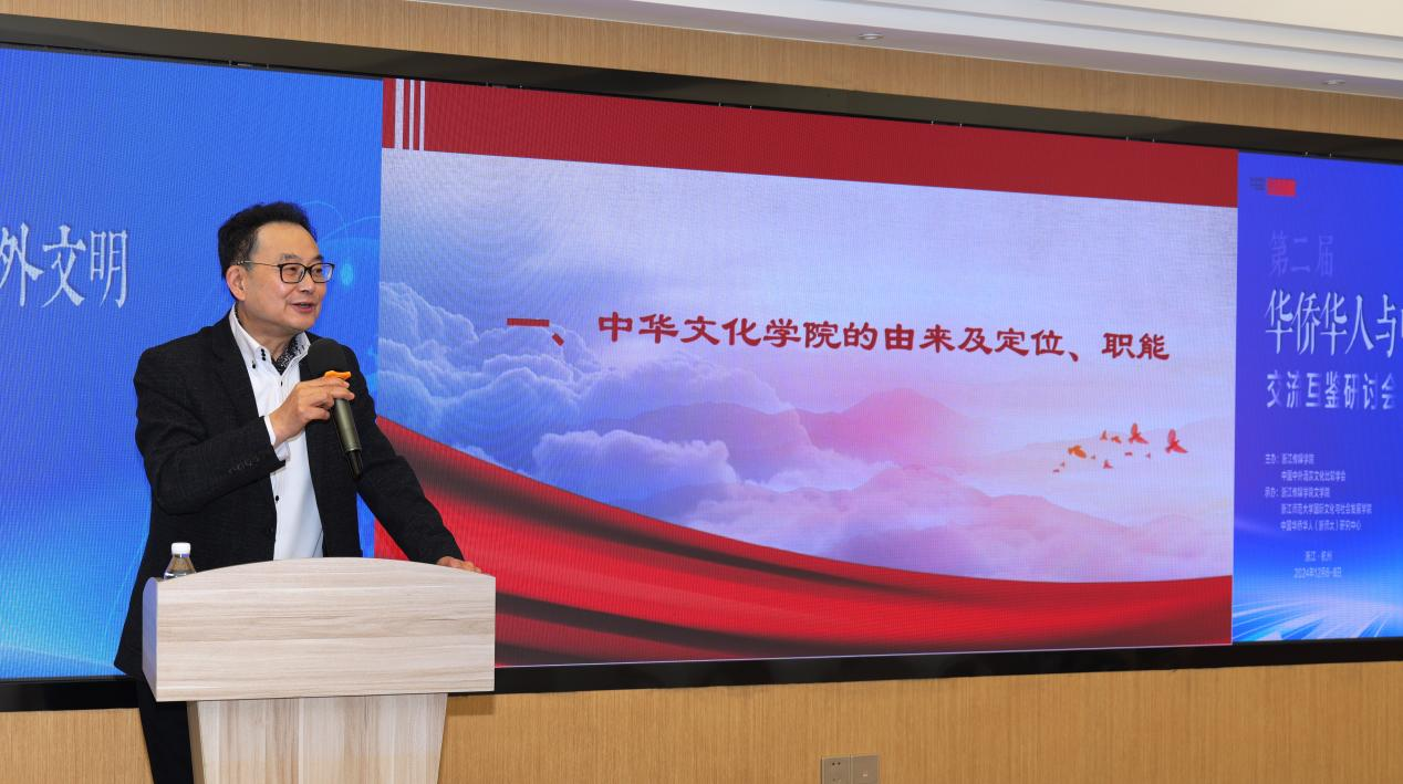 浙江中华文化学院二级巡视员张建伟以《讲好中国故事、传播中国声音、弘扬中华文化——以中华文化学院工作推进新时代海外统战和国际传播高质量发展》为题,介绍了中华文化学院的由来、定位及职能,生动展示建院20年来的探索与实践。