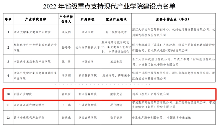 近日,浙江省教育厅办公室、浙江省经济和信息化厅办公室联合发布《关于公布2022年省级重点支持现代产业学院建设点名单的通知》,伟德官网与网易(杭州)网络有限公司共建的网易产业学院获批立项省级重点支持现代产业学院建设点,这是伟德官网继华策电影学院获首批省级产业学院后,获批的又一个建设点。