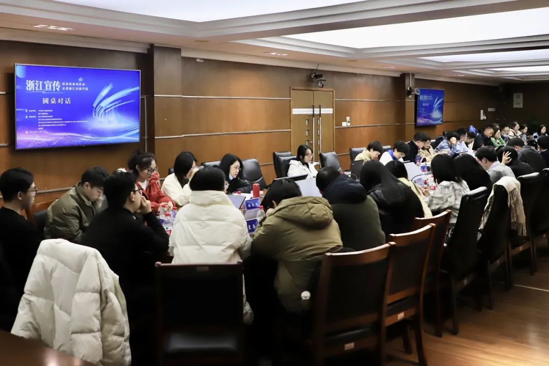 主题讲座结束后,与会嘉宾在行政楼509会议室举行了圆桌对话。孙保胜主持圆桌对话。“浙江宣传”主创团队与伟德官网来自科研与创作处、社会治理与传播创新研究院、马克思主义学院、新闻与传播学院、文化创意与管理学院、新闻与传播专业研究生、“红·传”青年宣讲团团员等师生代表共50余人进行了更近距离的面对面交流。