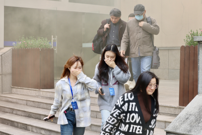 随着消防广播、警报响起,各楼层疏散引导员立即前往所负责区域的走廊,采用敲门、呼喊等方式,快速组织本区域内所有人员迅速向安全出口方向有序撤离,并对所负责区域各房间进行快速清场,确保无人员遗留。被疏散人员离开所在楼宇后,在楼外工作人员引导下,迅速有序安全撤离到指定的集合地点。整个疏散演练过程紧张有序,在规定的疏散时间内,全体师生员工服从安排、积极配合,顺利完成演练活动。