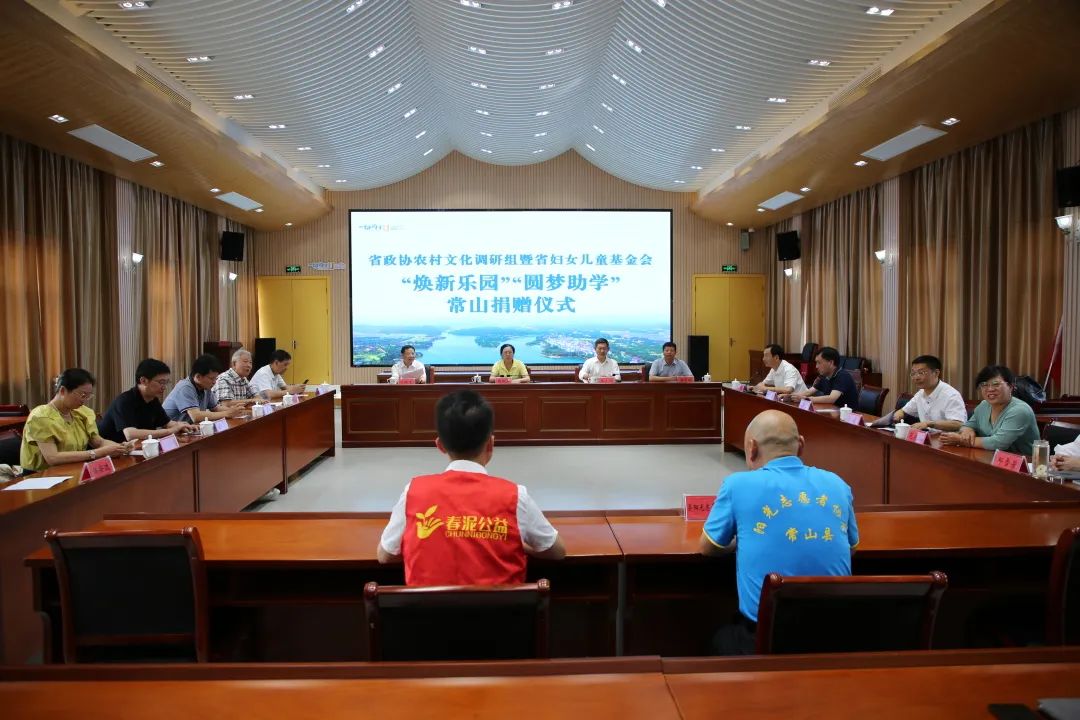 在常山,省政协社会科学界别组与省妇女儿童基金会共同举办“焕新乐园”“圆梦助学”项目捐赠仪式,向球川镇人民政府捐赠18万元公益基金,并实地考察金色同弓田园综合体项目和召开座谈会。徐小洲表示,常山乡村文化建设成效显著,要继续坚持走生态文明之路、尊文崇学之路、人才强县之路、文旅融合之路、文化传承创新之路。