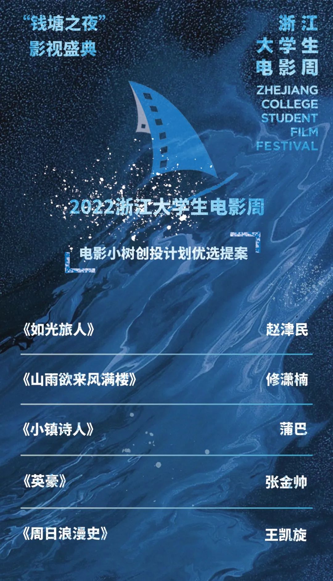 在颁奖晚会现场,由浙江大学生电影周组委会评选出的最佳影片(钱塘影像大奖)、最佳导演、最佳编剧、评委会特别奖等,以及电影小树成长创投计划“优选提案”等多项荣誉重磅揭晓。