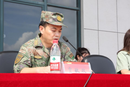 贾敏政在讲话中对全体军训教员提出“四字”要求:“率”是树立良好的模范形象,“严”是严格落实学校的军训纪律,“传”是传承军人优良作风,“帮”是第一时间为学生解决困难。