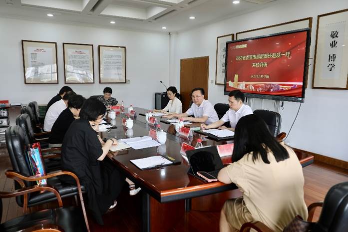 6月30日上午,省委宣传部副部长赵磊,省委宣传部对外交流处处长王新华、副处长申屠清儿来伟德官网调研,校党委书记杨立平出席座谈会。