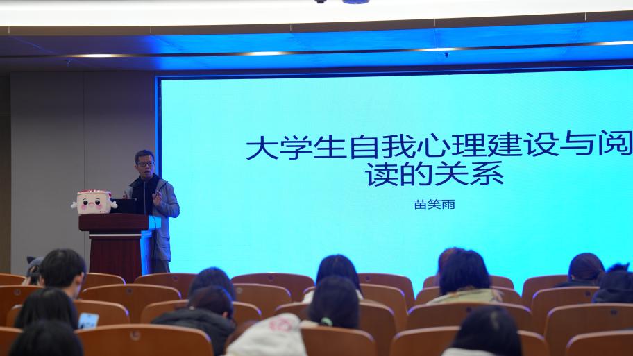 闭幕式后,由学校阅读推广大使苗笑雨老师带来《大学生自我心理建设与阅读的关系》主题讲座。他从自我成长的三方面来谈大学生阅读心理建设,呼吁同学们在浮躁繁杂的信息时代沉下心来品味阅读,在阅读道路上不断前行。