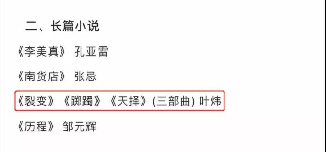长篇小说《踯躅》《裂变》《天择》(三部曲)是叶炜继“乡土中国三部曲”后出版的“转型时代三部曲”。与《乡土中国三部曲》讲述百年乡村故事不同,“转型时代三部曲”所表现的是裂变时代的众生相,重在表现改革开放四十年,转型中国巨变期知识分子面临复杂考验和他们的精神裂变,以此拷问一代知识分子的灵魂世界,书写一代知识分子的光荣与梦想。“转型时代三部曲”的叙事风格更强调叙事风格的多变,突出了语言的明快,既讲好“故事”,也讲“好的”故事,更要“好好”讲故事。