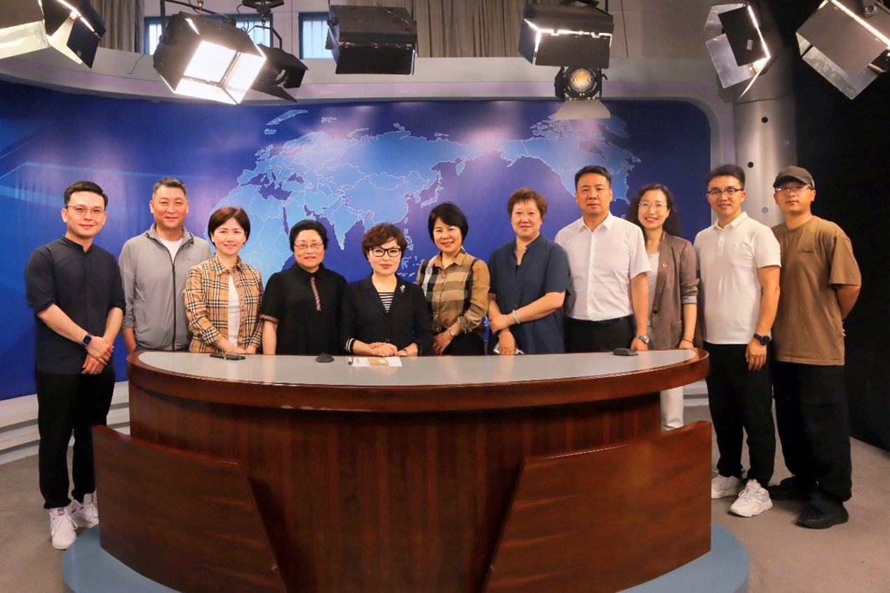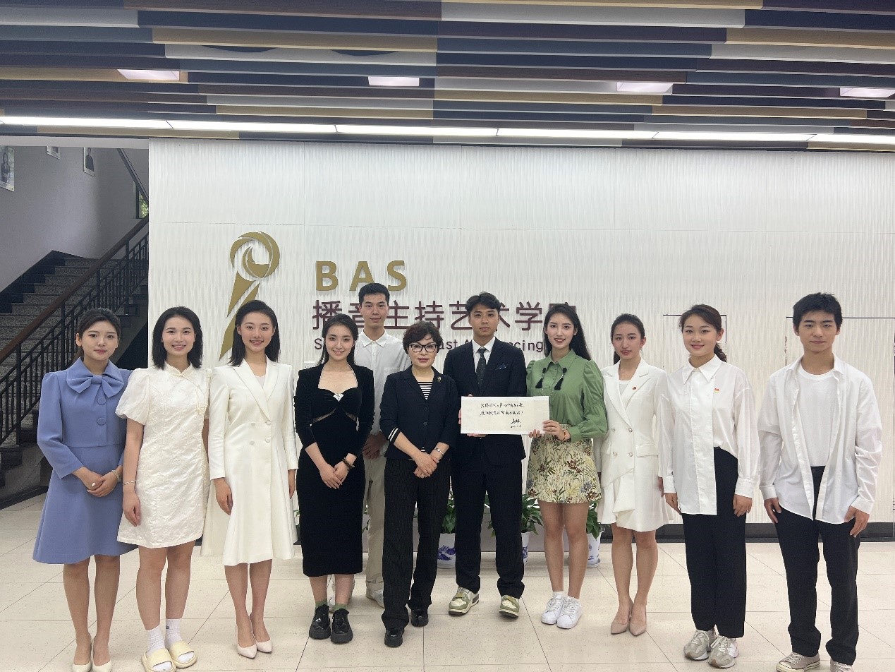 李瑞英在虚拟演播室,寄语学院“时代金话筒”品牌“传播时代之声,唱响青春之歌。祝‘时代金话筒’越办越好!”,并与学生代表合影留念。