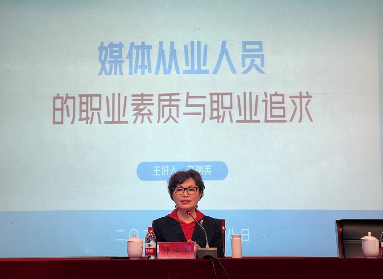当天下午,李瑞英在行政楼报告厅作了题为《媒体从业人员的职业素质与职业追求》主题讲座。她结合自身的工作经历,讲述了新时代传媒工作者必须具备政治素质、文化素质、专业素质、心理素质,并阐述了怎样培养个人的职业素养,告诉在座的未来荧屏“主打星”们:“不留遗憾比追求成功更重要;干什么事都要成为不可替代的人;脚下沾满多少泥土,心中便沉淀多少真情。”
