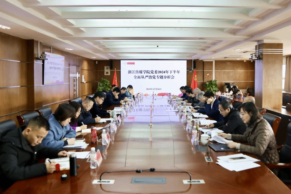 12月26日上午,学校党委召开2024年全面从严治党专题分析会,深入学习贯彻习近平总书记关于党的自我革命的重要思想,全面贯彻落实党的二十大、二十届三中全会、二十届中央纪委三次全会、全国教育大会精神和省委十五届五次、六次全会精神,总结2024年度全面从严治党责任落实情况,谋划部署2025年工作任务,着力推进全面从严治党和“清廉浙传”建设。校党委书记韦国潭主持会议并讲话,校党委委员参加会议,纪委委员、相关部门负责人、特约监察员代表列席会议。
