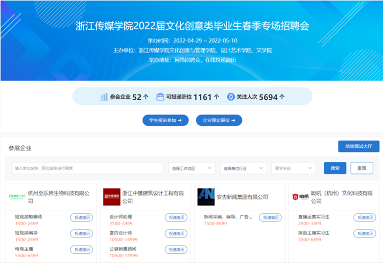 此次招聘会坚持以学生需求为导向,充分发挥互联网平台优势,实现用人单位与学生之间的精准对接,为伟德官网学子实习、就业保驾护航。毕业生们以认真的求职态度向用人单位展现了浙传学子的青春风采。学校将进一步整合校内外资源,拓展就业岗位信息渠道,为毕业生提供更多优质的就业机会,助力学生高质量就业。