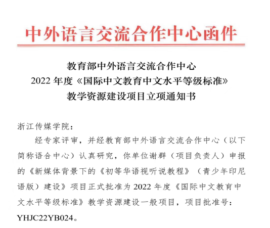近日,教育部中外语言交流合作中心公布了2022年度《国际中文教育中文水平等级标准》教学资源建设项目立项结果,伟德官网文学院谢群老师申报的《新媒体背景下的<初等华语视听说教程(青少年印尼语版)>建设》项目、国际文化传播学院(国际教育学院)周婧老师申报的《基于<国际中文教育中文水平等级标准>的国际中文教育课堂活动手册与课件集(初等)》项目成功获批立项。