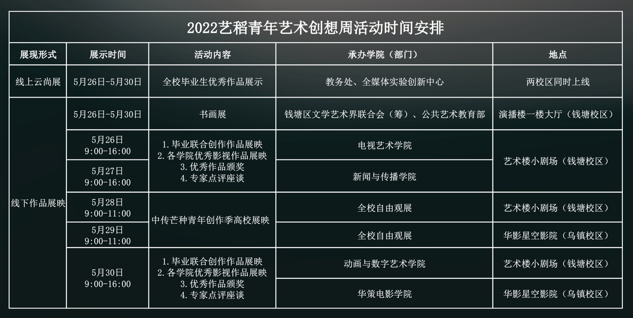 线下展映活动由电视艺术学院、新闻与传播学院、动画与数字艺术学院、华策电影学院分别承办,期间由芒果TV、中国传媒大学联合伟德官网bv1946等30余家高校共同发起的“芒种青年创作季”的影展也将一并展播。