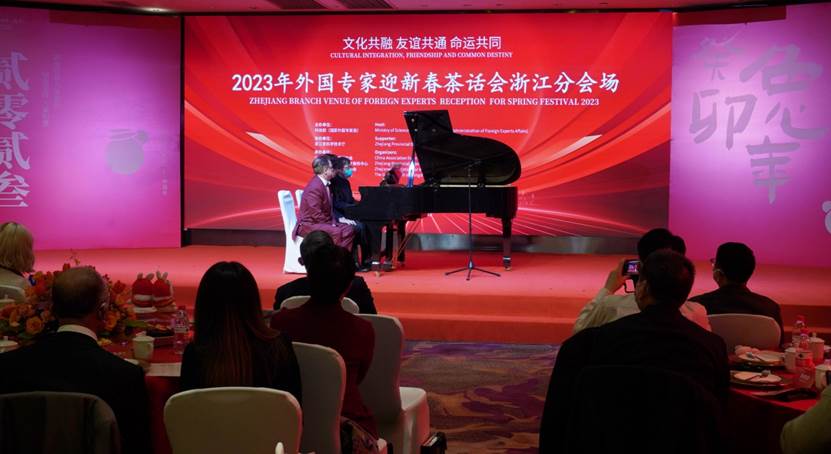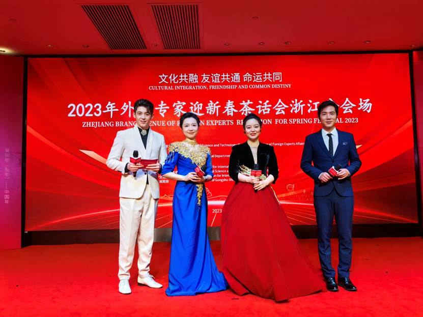 本次活动以“文化共融、友谊共通、命运共同”为主题,是科技部外国专家迎新春茶话会的浙江分会场。在北京主会场,科技部副部长、国家外国专家局局长李萌线上致辞。在浙江分会场,浙江省人民政府副秘书长蒋珍贵致辞,浙江省科技厅党组书记佟桂莉、厅长高鹰忠致欢迎词并宣布活动开始,省科技厅副厅长周土法,省公安厅、省教育厅、省外办等部门有关负责同志出席。茶话会现场与北京“云端”连线互动联欢,蒋珍贵、佟桂莉、高鹰忠代表浙江分会场与北京主会场互道新春祝福。