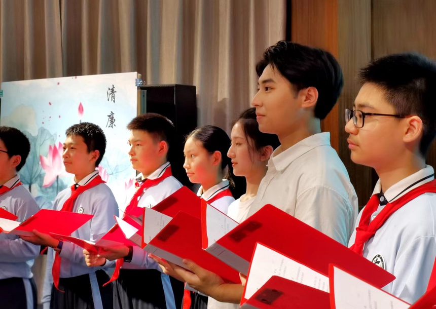 在两校联办的“廉以养德,声以化人——清廉之诵”主题活动中,通过“廉之意”“廉之声”“廉之韵”三个单元,精心设计了适龄化的清廉文化节目,播音专业学生为杭州市开元中学学生们录制了配音廉政微课小视频,朗诵了“浙传廉之声”《清廉在我心》,两校学生合诵《廉洁颂》,为开元中学赠送了定制的课本配套“红色主题朗诵音频”资料,现场宣读了《爱廉崇洁从我做起——清廉倡议书》,以“清”育美德,用“廉”润心田,参加现场活动的同学们深受感染,收获满满。