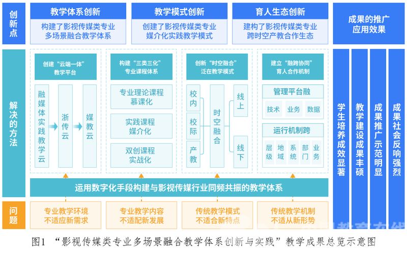 学校还面向新文科建设,不断创新多场景融合教学体系。一是首创“云端一体”平台建设方案,打破了学科专业之间、高校之间、高校与产业之间的时空壁垒,构建多场景融合教学体系,推动了我国影视传媒类专业媒体融合环境下的转型和新文科建设;二是按照“技艺+专业+选拔+创新”分层建设媒介化课程群和教学媒体矩阵,构建了专业理论类课程慕课化、实践类课程媒介化、双创类课程实战化的“三类三化”课程体系,形成了产教深度融合媒介化实践教学模式;三是强化媒教云、媒体矩阵、线上课程、生产传播等教学资源共享,进行政校、产教、校校共建,推进“融跨协同”合作育人机制,构建了跨时空产教合作生态。