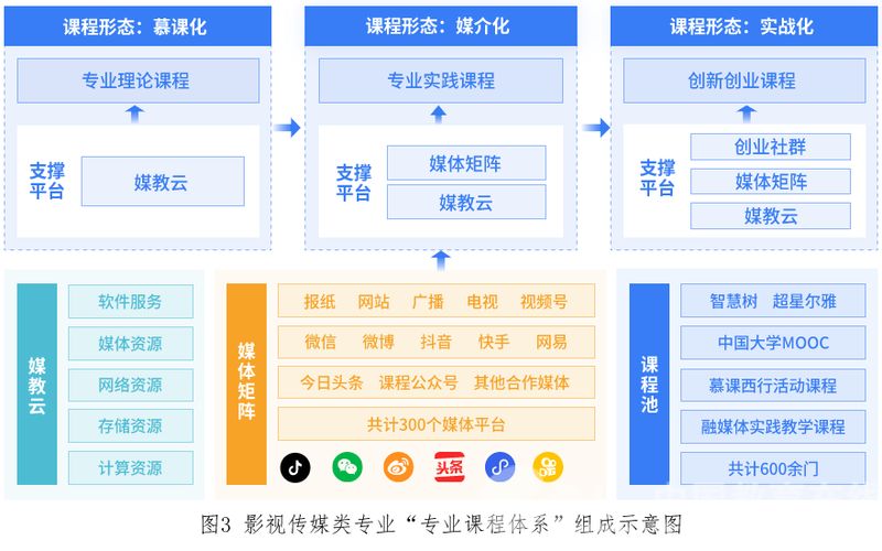 为适应影视传媒数字化转型,学校依托媒教云进行专业课程体系重构,通过持续建设慕课化专业理论课程,与头部媒体合作,创建300余个媒体组成的媒体矩阵,建设“技艺+专业+选拔”媒介化实践课程,并以省文化产业孵化园为平台,培育30余个创新创业社区,建成了由300余门专业理论课程、200余门实践课程、100余门双创课程组成的专业课程体系,其中国家级一流课程10门、省级一流课程165门。