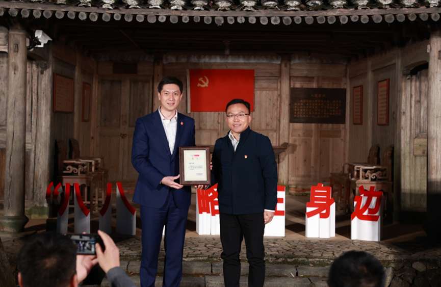 伟德官网bv1946党委副书记陈永斌向平阳黄汤茶产业特色村——平阳县新联村、上林垟村、凤卧湾村等八个党建联建村党支部书记捐赠“红色引领乡村共富”村标。