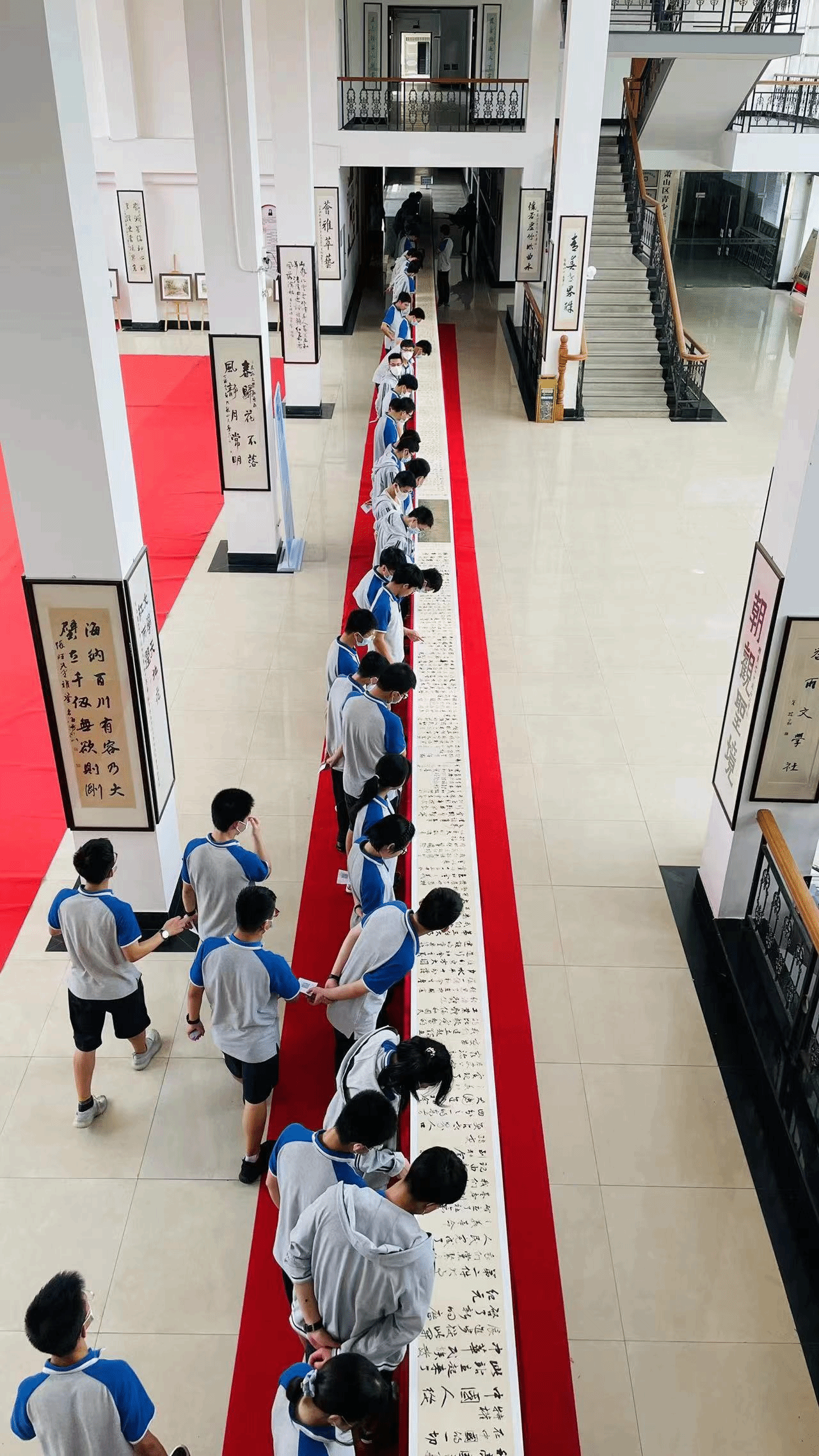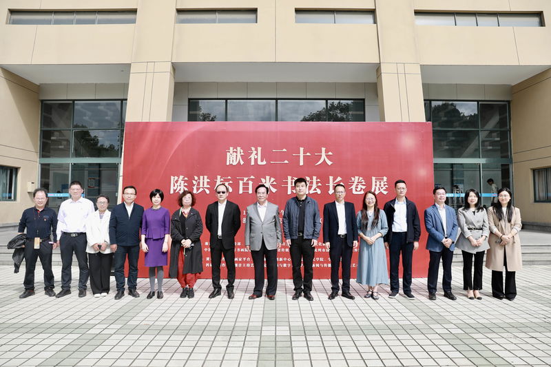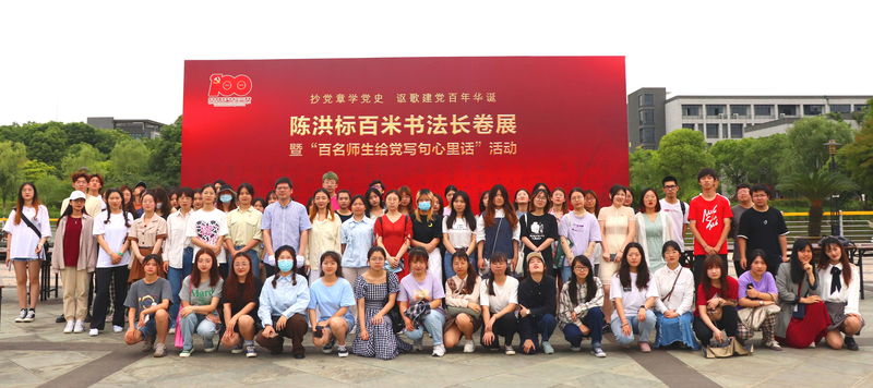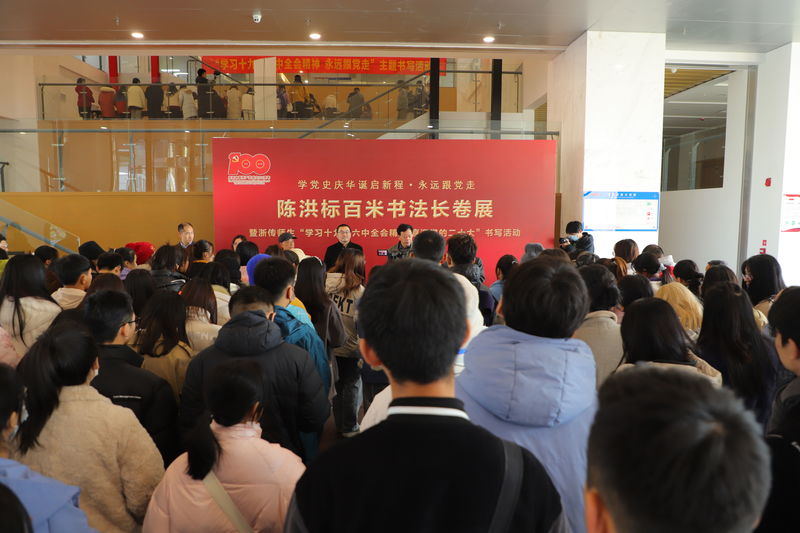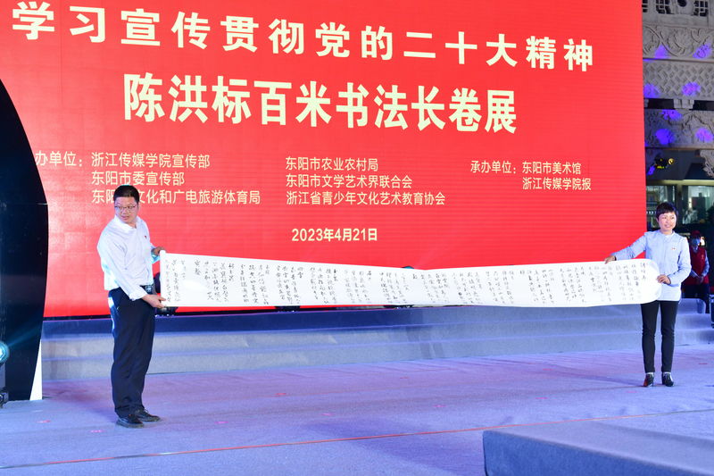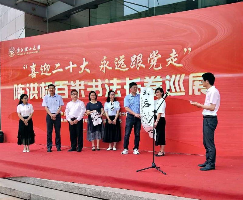 2021年5月28日,在桐乡校区思镜湖广场举行“陈洪标百米书法长卷展”首展,这幅《抄录<中国共产党章程>总纲》百米长卷引起了师生的强烈反响。