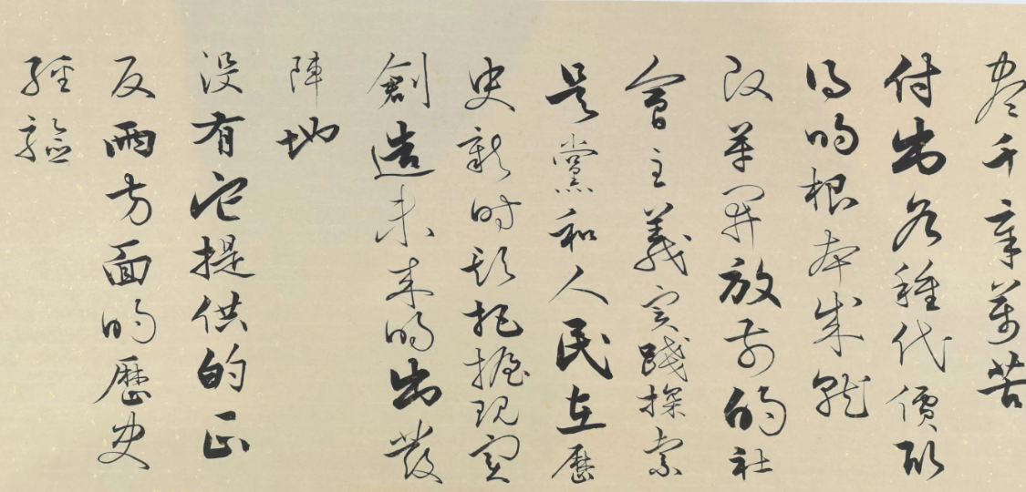 首先对传统书法的书写断句格式进行了新的尝试,突破书写不断句的传统,改为按照现代文本的标点符号进行断句,形成上下起伏、错落有致的流动感,让整幅百米长卷不再是黑压压一片,变沉闷压抑为空灵自然,又没有因留白太多而虚空乏力,也没有一丝气短韵散的迹象,反而具有一种史诗般的画卷徐徐展开的艺术感觉。