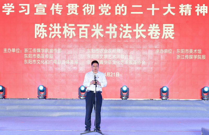 这次“学习宣传贯彻党的二十大精神 陈洪标百米长卷书法展”,和之前的9场“陈洪标百米书法长卷展”有所不同。整个展览的格局,形成以《党章》总纲百米长卷为引领,加上浙江和东阳地方内容的3幅长卷为佐辅,不仅主题鲜明,而且具有“浙江味”和“东阳味”的特色,成为这次展览的一大特点。