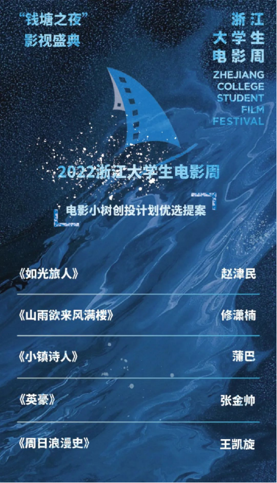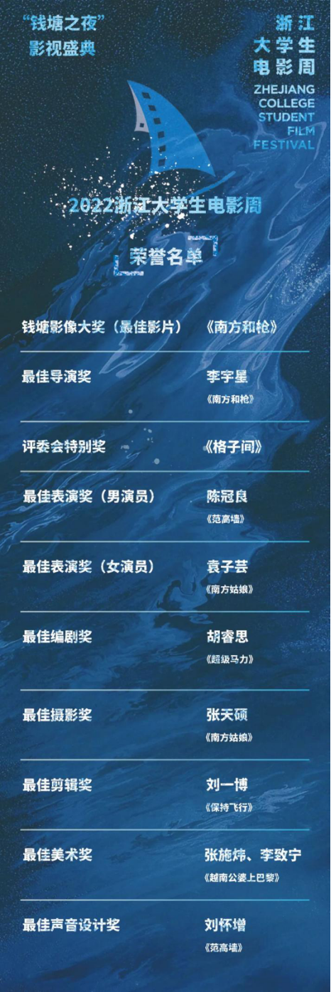 颁奖晚会现场,由浙江大学生电影周组委会评选出的最佳影片(钱塘影像大奖)、最佳导演、最佳编剧、评委会特别奖等,以及电影小树成长创投计划“优选提案”等多项荣誉重磅揭晓。