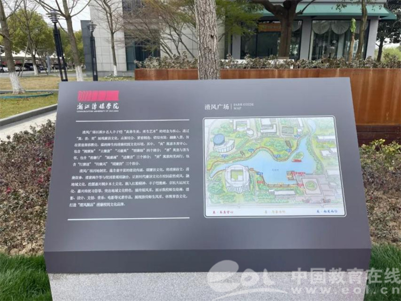 记者发现,广场因地制宜,蕴含了丰富的建设内涵。颂廉洁文化,将清廉诗文、清廉故事、清廉画作与校园“清风绿植”“清风长廊”等自然人文景观相融合,让新时代廉洁文化在校园蔚然成风。融地域文化,挖掘嘉兴桐乡本土文化,融入红船精神、丰子恺漫画、京杭大运河文化、嘉兴传统习俗等,突出地域文化特色。展传媒风采,展示浙传师生绘画、摄影、设计、文创、音乐、电影等元素作品,展现浙传师生风采,体现青春文化,打造“清风颜品”清廉校园文化品牌。