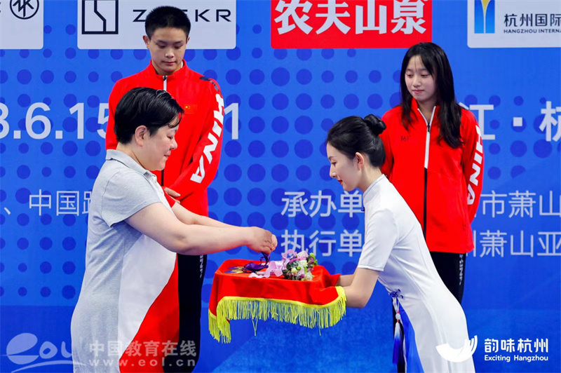 张澎萱作为颁奖礼仪志愿者在测试赛上进行服务