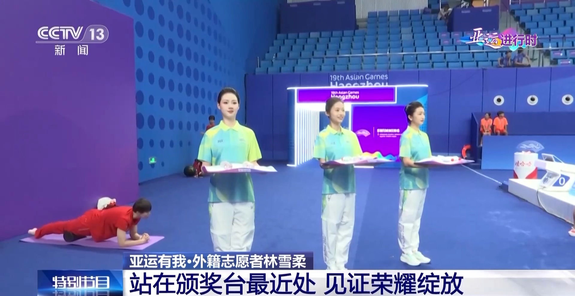 马来西亚留学生林雪柔是杭州亚运会游泳赛场的一名礼仪志愿者,也是离领奖台距离最近的志愿者,托举起一枚枚沉甸甸的奖牌,见证赛场的荣耀时刻,用专业的志愿服务为亚运添彩。