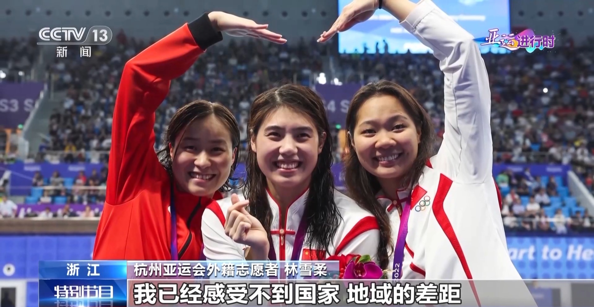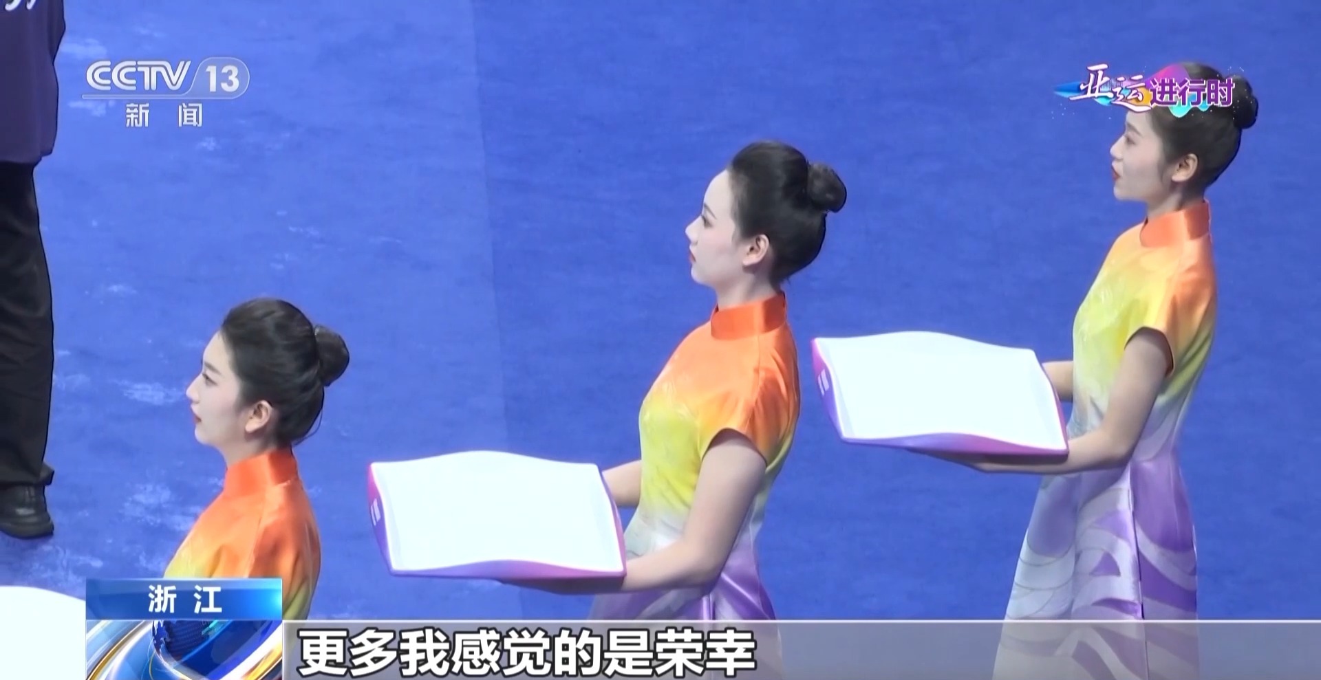 杭州亚运会外籍志愿者 林雪柔:更多我感觉的是荣幸,因为我们能够以颁奖礼仪志愿者的一个身份,在颁奖典礼上为他们递上奖牌。我看到的是各位运动员们,他们非常热爱这个项目的一种精神,对我来说是一个非常大的鼓舞,要保持这种热爱的心,在自己热爱的事情上努力。