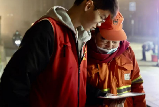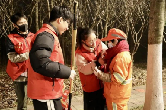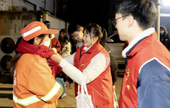2023年12月29日,晨光熹微、薄雾笼罩,钱塘区江东一路、江东四路以及河庄街道办事处河景路上,出现了20余名身穿红色马甲的学生,为正在值勤的环卫工人送去热腾腾的早饭并帮他们系上温暖的红围巾。