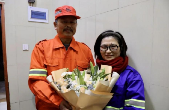 洒水车驾驶员魏国明和公厕保洁员高茶仙携手相伴30年,一直是环卫大家庭里的模范夫妻,当得知还有4天就是高茶仙的生日,“学霸宅一族”的同学和魏国明一起为她准备了生日礼物和鲜花。看到丈夫为自己亲手挑选的发箍,高茶仙开心地笑道:“喜欢,老公送的都喜欢”。