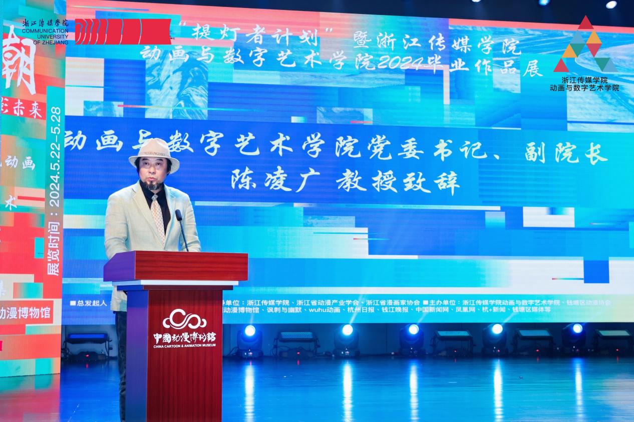 (动画与数字艺术学院党委书记、副院长 陈凌广教授)动画与数字艺术学院党委书记、副院长陈凌广教授为开幕式致辞。他指出,动画与数字艺术学院深入推进新时代党的建设,以“提灯者计划”为抓手,紧紧围绕着党建引领、专业过硬、紧贴行业、传媒底色,突出“美育+”的专业思政特色理念,通过“12345育人体系”的建构,将弘扬红色根脉建设与专业能力培养紧密结合,致力于“文化+艺术+技术”的合力赋能,探索“交叉型、复合型、前沿型”人才培养新模式,保障学院高质量内涵式发展,为学校高质量发展贡献力量。