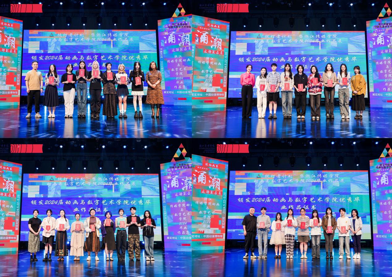 启幕式上,嘉宾们为2024届优秀毕业作品获得者颁发证书。 2024毕业展是动画与数字艺术学院与中国动漫博物馆二次联合策展,面向全社会公开亮相,本次展览汇集了学院动画、漫插画、数字艺术三大专业的优秀作品,凝聚了动艺师生的智慧和心血,希望借此为新时代下的中国动漫产业发展提供创新案例与思路。涌潮波涛,奔流向前,让我们跟随小编一起看看吧!