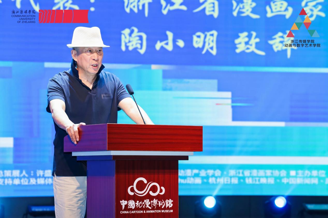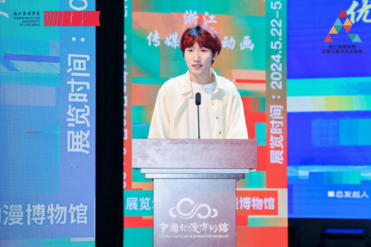 (浙江省漫画家协会主席 陶小明)浙江省漫画家协会主席、动画与数字艺术学院客座教授陶小明在致辞中表示,本次作品展不仅展现了精湛的艺术技巧,更体现了同学们对社会、对人性深刻的思考和独到的见解,无论是以幽默诙谐的方式呈现观点,还是以深刻动人的故事表达现实,都体现了同学们对艺术的热爱和对创新的追求。最后,他向毕业生们送上了真挚的祝福,鼓励他们保持对艺术的热情,为世界带来更多的色彩和活力。