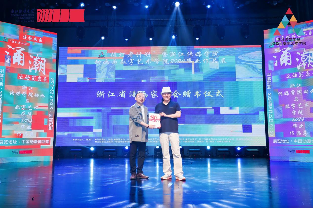(浙江省漫画家协会赠书仪式)在各位领导嘉宾的见证下,现场进行了2024动画与数字艺术学院客座教授聘任仪式、浙江省漫画家协会赠书仪式和业界硕士生导师聘任仪式。受聘客座教授有:浙江省漫画家协会主席 陶小明浙江大学教授、博士生导师 盘剑浙江省漫画家协会副主席兼秘书长 邹强浙江师范大学“双龙学者”特聘教授 王雷受聘业界硕士生导师有:玄机科技《斗罗大陆》导演 唐宏宁网易集团党委副书记、公共事务部总经理 方伟龙友义传媒集团董事长 张竹浙江中南卡通股份有限公司总经理 沈玉良向正科技有限公司总经理 郑樟银杭州蒸汽工场文化创意有限公司总经理 成伟芳博地控股集团有限公司,投资管理总监 梁家发浙江棱镜全息科技有限公司副总经理兼品牌顾问 任鸿翔中世媒(浙江)文化传播有限公司董事长 周渊麦朴文旅股份有限公司董事长 徐琦花果山传媒总经理 周建敏wuhu动画人空间创始人 王善扬杭州友诺动漫有限公司总经理 张磊